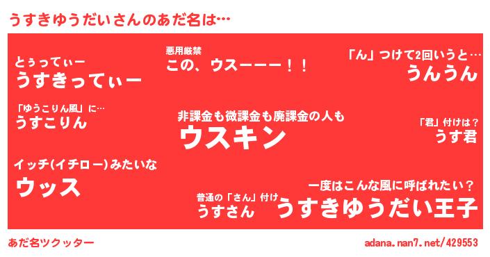 | ヒーロー風カッコイイあだ名 | 『スーパーウスキユウダイ』『魔戒騎士ウス』『仮面ウスダー』 |