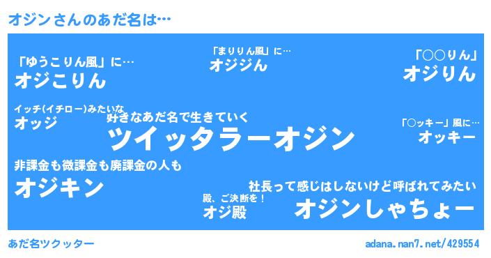 | 男性向けラノベタイトル風あだ名 | 『ノーゲーム・ノーオジン』『魔法科高校のオジン』『緋弾のオジン』 |
