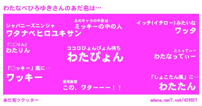| ヒーロー風カッコイイあだ名 | 『スーパーワタナベヒロユキ』『魔戒騎士ワタ』『仮面ワタダー』 |