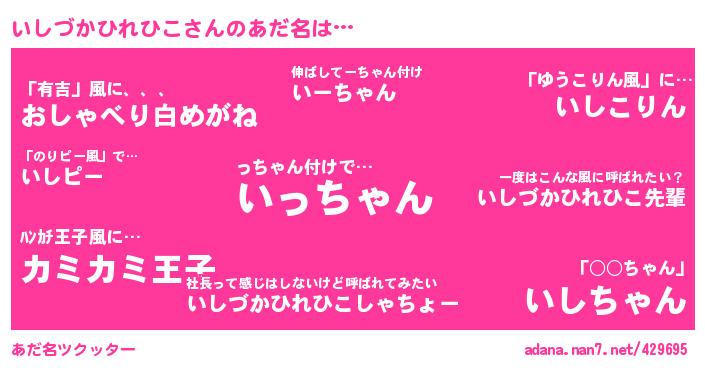 | 意味不明あだ名 | 『住所不定無職いしづかひれひこ(40歳)』『自称いしづかひれひこ』 |