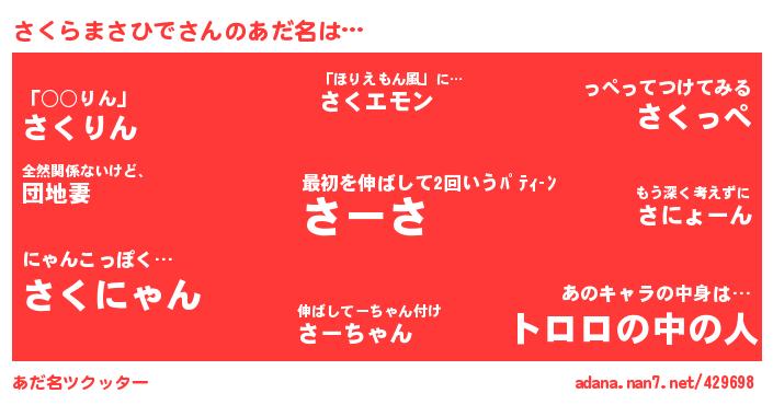 | ヘコむあだ名 | 『さくふぇ~』『豆乳』『さくぷりん』『さくらまさひで(小並感)』 |