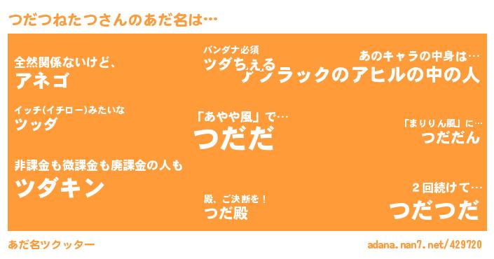 | ポケモン風あだ名 | 『ツックウザ』『ツダセウス』『ヒツダツネタツ』『ツダツダネ』 |