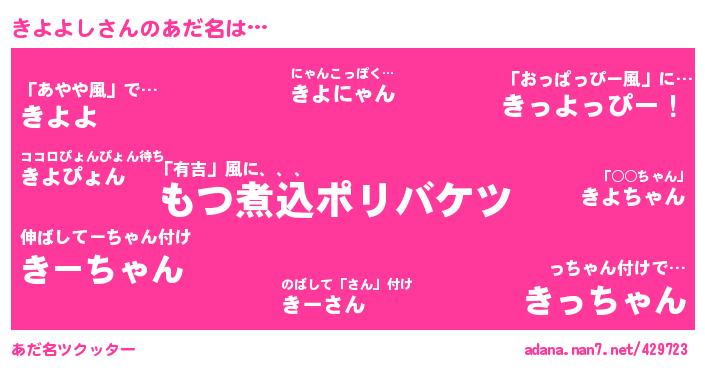 | 男性向けラノベタイトル風あだ名 | 『ノーゲーム・ノーキヨヨシ』『転生したらきよよしだった件』 |