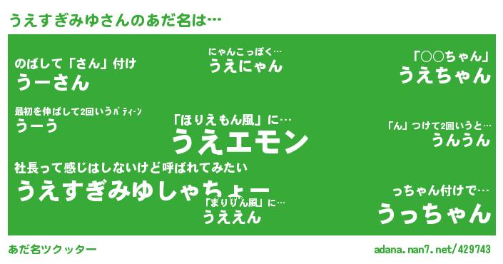 | ヒーロー風カッコイイあだ名 | 『仮面ウエダー』『ウルトラうえすぎみゆマン』『愛の使者うえすぎみゆ』 |