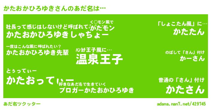 | 男性向けラノベタイトル風あだ名 | 『うちのかたおかひろゆきが世界を掌握している!』『かたおかひろゆきの憂鬱』 |