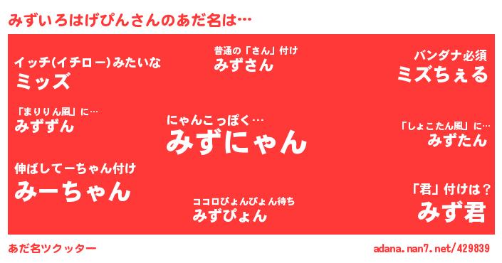 | ヘコむあだ名 | 『みずふぇ~』『豆乳』『みずぷりん』『みずいろはげぴん(小並感)』 |