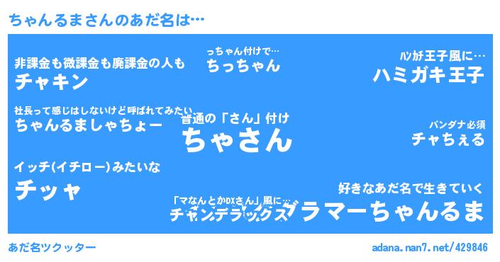 | ヘコむあだ名 | 『ちゃふぇ~』『豆乳』『ちゃぷりん』『ちゃんるま(小並感)』 |