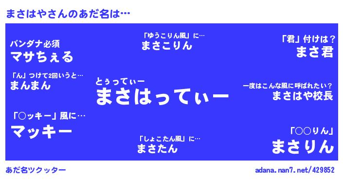 | ヘコむあだ名 | 『まさふぇ~』『豆乳』『まさぷりん』『まさはや(小並感)』 |