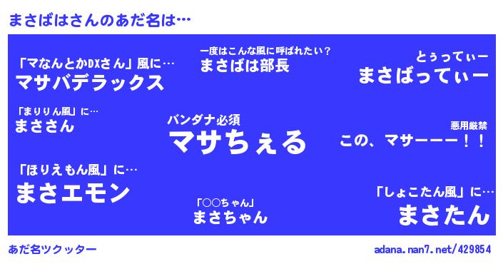 | ヒーロー風カッコイイあだ名 | 『仮面マサダー』『友情の使者まさばは』『スーパーマサバハ』 |