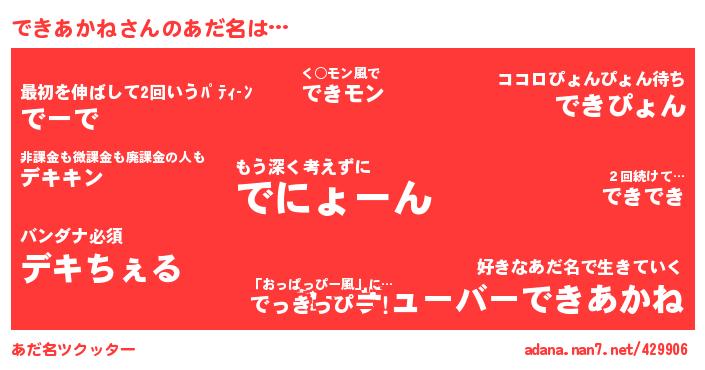 | ヘコむあだ名 | 『できふぇ~』『豆乳』『できぷりん』『できあかね(小並感)』 |