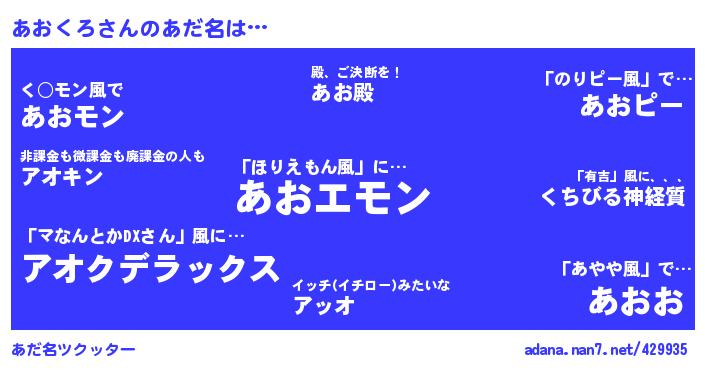 | ポケモン風あだ名 | 『アオキング』『アックウザ』『アオクダネ』『メロアッオ』 |