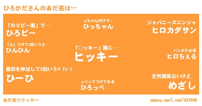 | 男性向けラノベタイトル風あだ名 | 『ひろかだの嫁は女の子じゃないと思った?』『転生したらひろかだだった件』 |