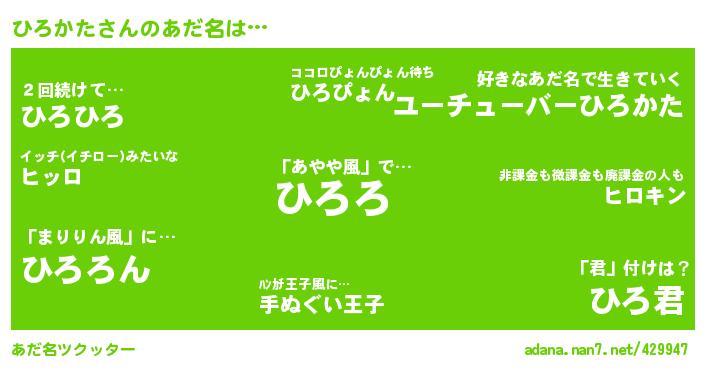 | 意味不明あだ名 | 『ニラ科ひろかた属』『住所不定無職ひろかた(79歳)』『自称ひろかた』 |