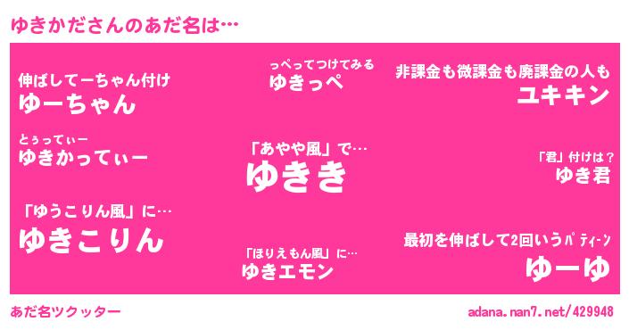 | ポケモン風あだ名 | 『ヒユキカダ』『ユキゴンZ』『ユックウザ』『ゼニユキ』 |
