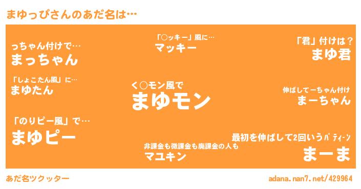 | ポケモン風あだ名 | 『ヒマユッピ』『マックウザ』『マユキング』『メロマッユ』 |