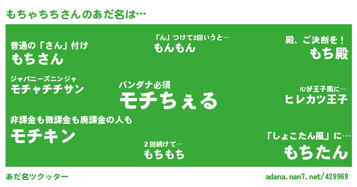 | 男性向けラノベタイトル風あだ名 | 『モチャチチアートオンライン』『魔弾の王ともちゃちち』 |