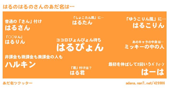 | 意味不明あだ名 | 『自称はるのはるの』『はるのはるのフォーエバー』 |