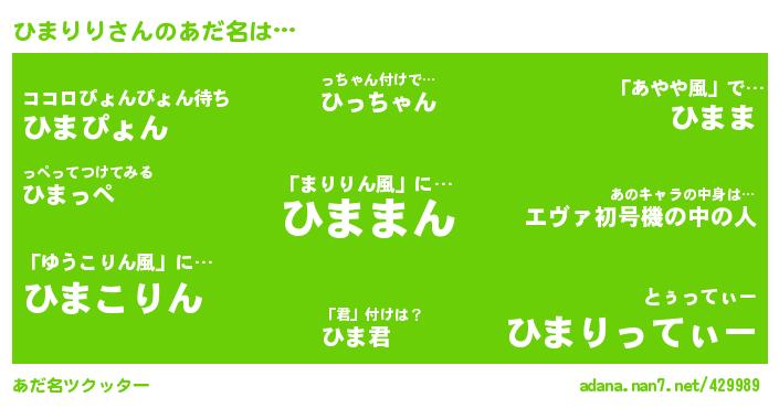 | ヘコむあだ名 | 『ひまふぇ~』『豆乳』『ひまぷりん』『ひまりり(小並感)』 |