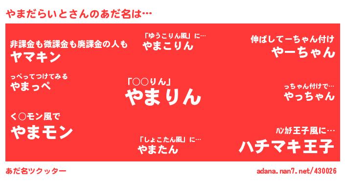| 意味不明あだ名 | 『住所不定無職やまだらいと(40歳)』『やまだらいとフォーエバー』 |