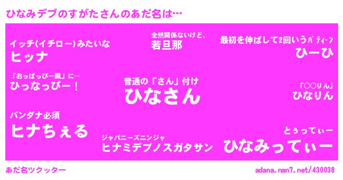 | ポケモン風あだ名 | 『ヒナミダネ』『ゼニヒナ』『ヒヒナミデブノスガタ』『ヒナチュウ』 |