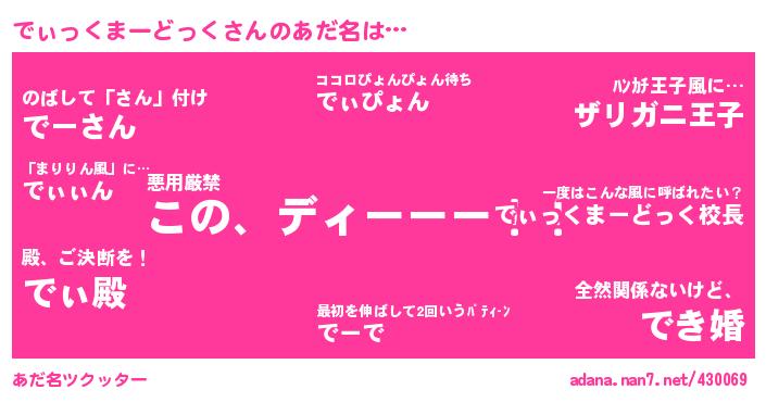 | 男性向けラノベタイトル風あだ名 | 『ディックマードックアートオンライン』『魔弾の王とでぃっくまーどっく』 |
