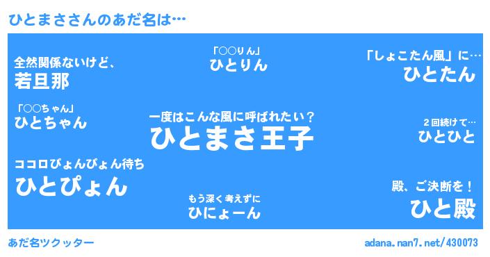 | ヒーロー風カッコイイあだ名 | 『スーパーヒトマサ』『ウルトラ戦士ヒトマサ』『慈愛の使者ひとまさ』 |