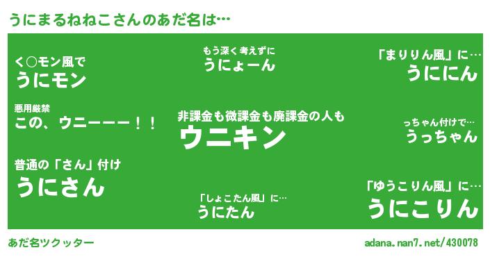 | ポケモン風あだ名 | 『ウニマダネ』『ウックウザ』『ウニチュウ』『ヒウニマルネネコ』 |