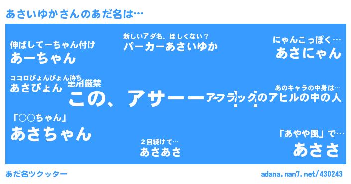 | ヘコむあだ名 | 『あさふぇ~』『豆乳』『あさぷりん』『あさいゆか(小並感)』 |