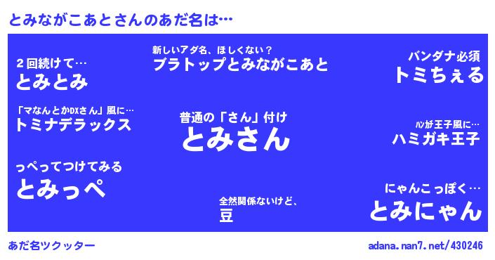 | ヘコむあだ名 | 『とみふぇ~』『豆乳』『とみぷりん』『とみながこあと(小並感)』 |