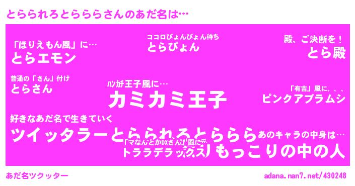 | 男性向けラノベタイトル風あだ名 | 『ノーゲーム・ノートララレロトラララ』『魔法科高校のとらられろとららら』 |