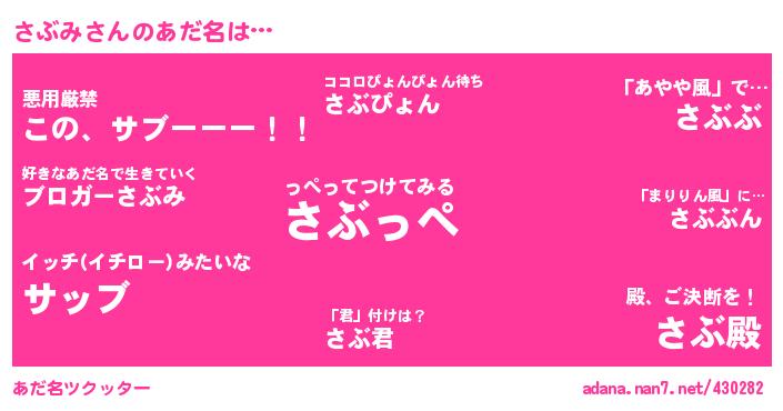 | 男性向けラノベタイトル風あだ名 | 『さぶみの嫁は女の子じゃないと思った?』『転生したらさぶみだった件』 |