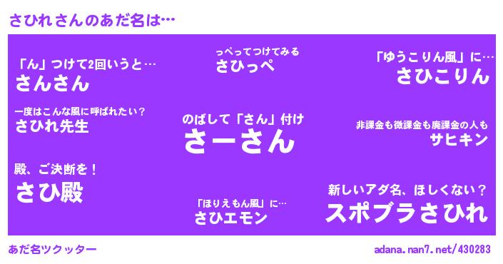 | ヘコむあだ名 | 『さひふぇ~』『豆乳』『さひぷりん』『さひれ(小並感)』 |