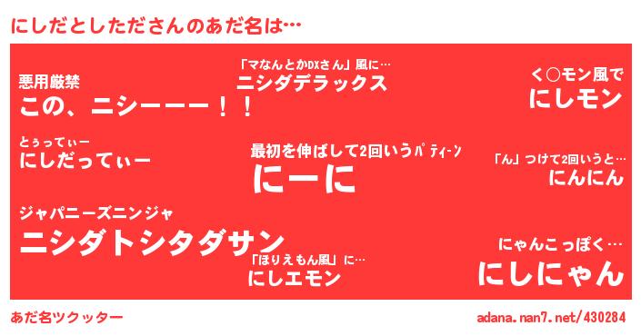 | ポケモン風あだ名 | 『ヒニシダトシタダ』『ニーシイ』『ニシゴンZ』『メロニッシ』 |