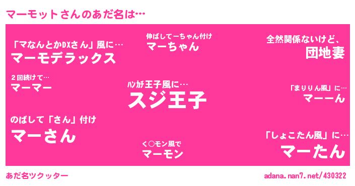 | ヒーロー風カッコイイあだ名 | 『究極戦士マーモット』『仮面マーダー』『銀牙騎士マー』 |