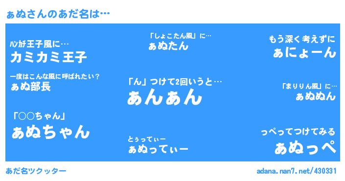 | 男性向けラノベタイトル風あだ名 | 『うちのぁぬが世界を掌握している!』『魔法科高校のぁぬ』『ぁぬの憂鬱』 |