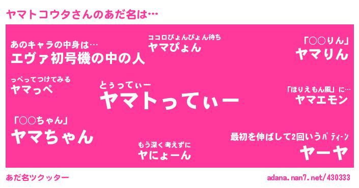 | 欧米人風あだ名 | 『ヤマトコウタクリステル』『マイケルヤマトコウタ』 |