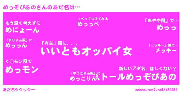 | ヘコむあだ名 | 『めっふぇ~』『豆乳』『めっぷりん』『めっぞぴあの(小並感)』 |