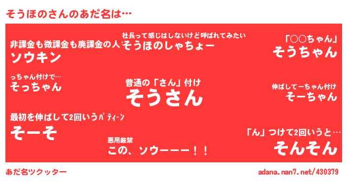 | 意味不明あだ名 | 『住所不定無職そうほの(40歳)』『自称そうほの』『永久保存そうほの』 |
