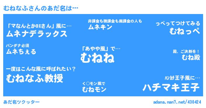 | ヒーロー風カッコイイあだ名 | 『仮面ムネダー』『ウルトラ戦士ムネナフ』『幻影騎士ムネ』 |