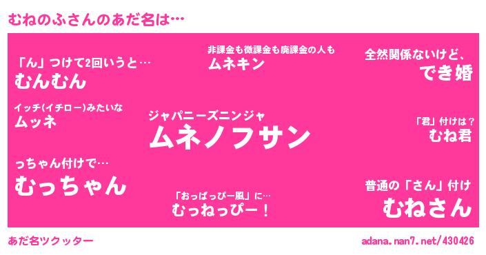 | 男性向けラノベタイトル風あだ名 | 『ノーゲーム・ノームネノフ』『はたらくむねのふさま!』 |