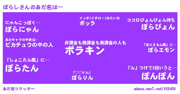 | 男性向けラノベタイトル風あだ名 | 『この素晴らしい世界にぽらしを!』『ノーゲーム・ノーポラシ』 |