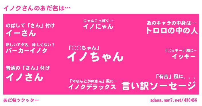 | ポケモン風あだ名 | 『イノクダネ』『イーノイ』『イックウザ』『イノチュウ』 |