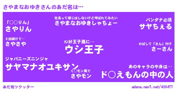 | 女子向けラノベタイトル風あだ名 | 『さやまなおゆき様がみてる』『シンデレラさやまなおゆき家の靴箱館』 |