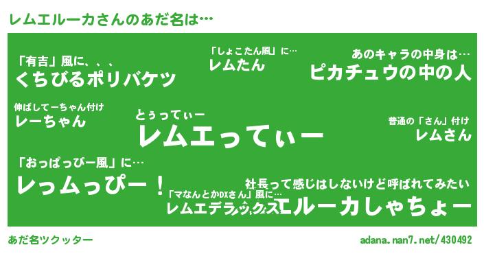 | ポケモン風あだ名 | 『レムゴンZ』『レムセウス』『メロレッム』『レムキング』 |