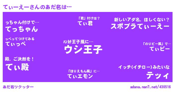 | ヘコむあだ名 | 『てぃふぇ~』『豆乳』『てぃぷりん』『てぃーえー(小並感)』 |