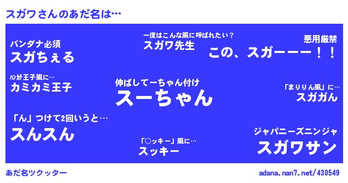 | ポケモン風あだ名 | 『メロスッガ』『スガワダネ』『ゼニスガ』『スガチュウ』 |
