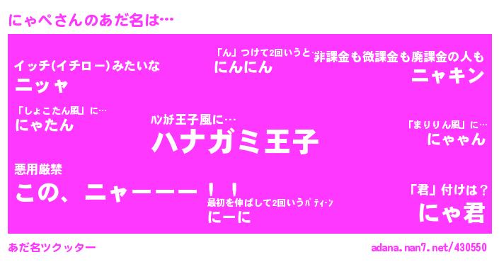 | ヘコむあだ名 | 『にゃふぇ~』『豆乳』『にゃぷりん』『にゃぺ(小並感)』 |