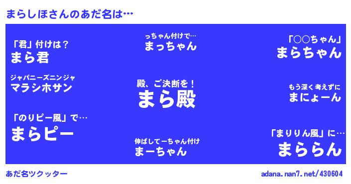 | ヘコむあだ名 | 『まらふぇ~』『豆乳』『まらぷりん』『まらしほ(小並感)』 |