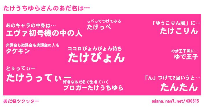 | 意味不明あだ名 | 『住所不定無職たけうちゆら(40歳)』『眠気覚ましガムたけうちゆら味』 |