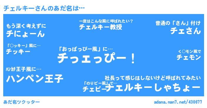 | 料理風あだ名 | 『ネギたっぷりチェルキーの南蛮漬け』『ウインナーとチェルキーのグラタン☆』 |
